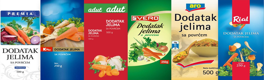 Na bazi liderske pozicije na tržištu kuhinjske soli, Interkomerc je obezbedio stratešku prednost i poziciju za proizvodnju univerzalnih začina – dodataka jelima. Osnovni sastojak dodataka jelima je upravo so i to do 60% od celokupne sadržine, pa je objektivna i liderska pozicija i konkurentska prednost u proizvodnji. Univerzalni začini se proizvode pod privatnim robnim markama maloprodajnih lanaca: Delhaize – Premia i Adut Delvel Pro – Vele Metro – Aro Veropoulos – Vero Idea – K Plus i Rial |